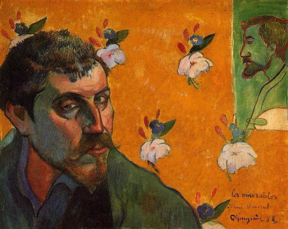 △《铃兰》局部 梵谷喜欢用纯色点画的绘画技术。它去掉了轮廓线,把每个形状都分解成彩色小点构成的区域,不仅使色彩化整为零,而且传达了他追求光线和色彩的情绪。 梵谷生前并不为世人所理解,他曾说“死很难,但活着更难”。在穷困潦倒之时梵谷饱尝世态炎凉、人情冷暖,但他反而鞭策自己在逆境中寻找光明,他所画的《铃兰》系列产品就体现了他对心灵的理解。 梵谷与高更“相爱相杀”的兄弟情 1887年,梵谷和法国画家高更在巴黎相遇,彼时两人都处于生活的低潮期,他们成了惺惺相惜的难兄难弟,甚至各自画了一幅《自画像》给对方。